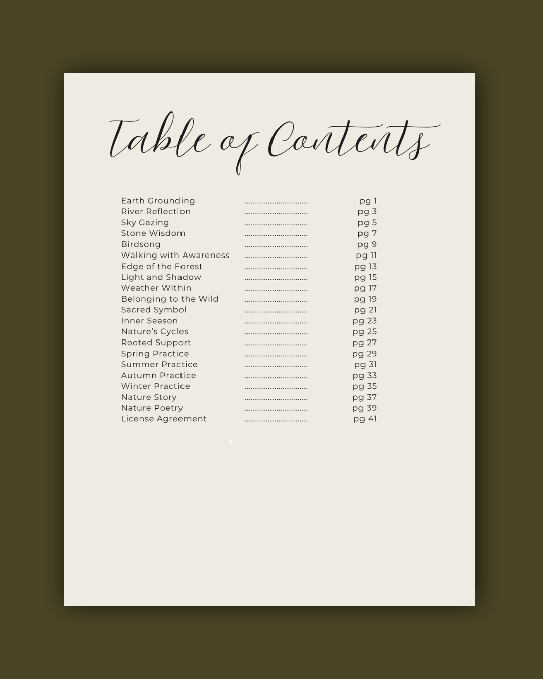 These worksheets are designed for personal and/or professional use, and each practice is designed to be simple and accessible. All that's required is a pen, a journal or notebook, and places where you can sit quietly, tune in, and observe the nature around and within you. If you're a coach, meditation teacher, retreat leader, or other wellness professional: You are welcome to use these practices with clients, students, or groups. They can be: • Read aloud in live or recorded sessions • Used to guide in-person or virtual classes • Incorporated into courses as homework or group practice • Used during retreats or workshops • Incorporated into mindful walks, hikes, or outdoors activities The scripts come with a professional license agreement so you can feel confident when using them with your clients.